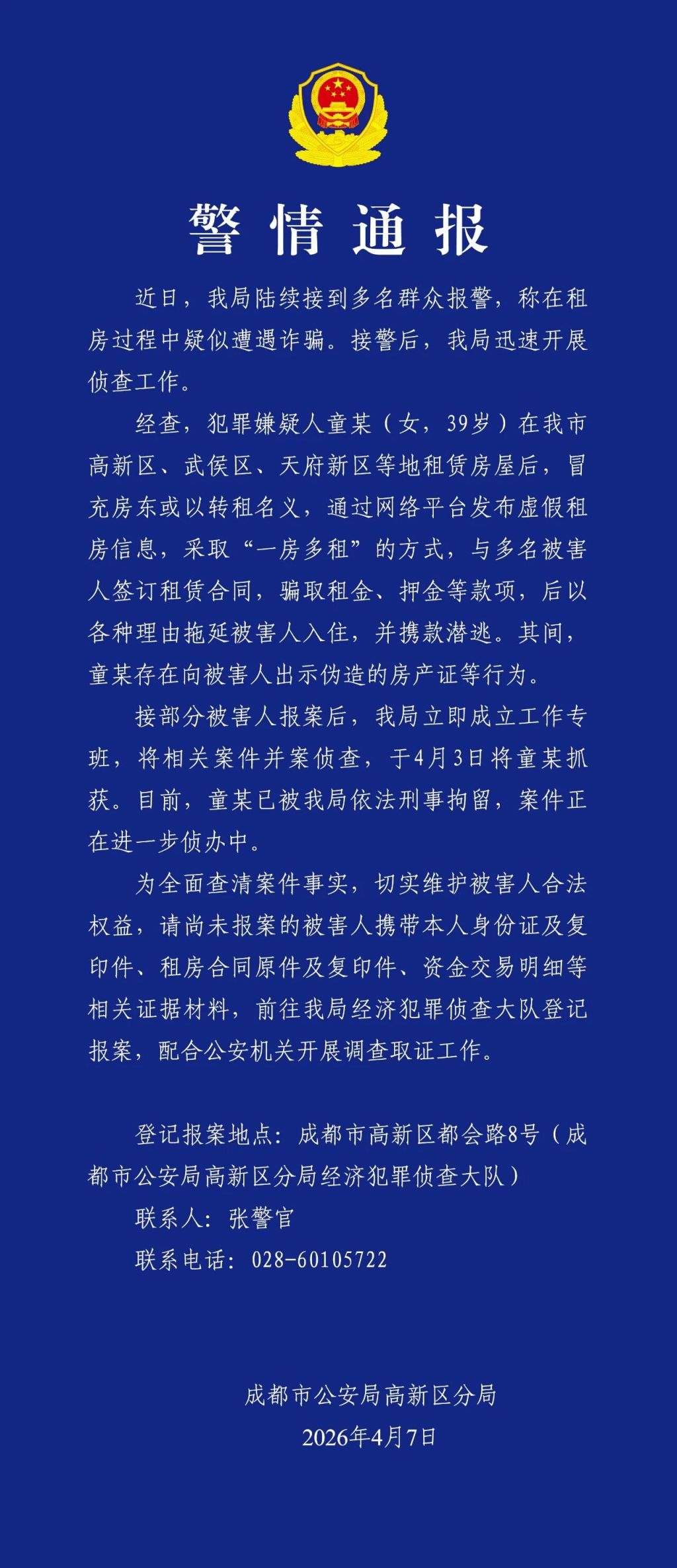汇金通配资平台 成都高新警方通报:请被害人速来报案